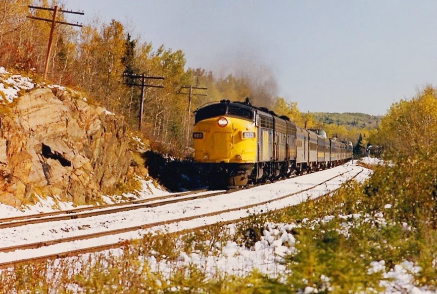 Whenever there was a derailment on the CP between Winnipeg and Thunder bay, VIA would reroute No 1 and No 2 by way of CN trackage from Winnipeg on the CN Redditt and Allanwater Subs to Superior Junction, then the entire CN Graham Sub to Conmee Junction and then the balance of the CN Kashabowie Sub through the Neebing yard and then over the CN Mission Spur to the transfer track with CP at the west end of Westfort yard and finally down to the CP station in Fort William. No 2 with 6542-6626 pulls by the station at Kakabeka Falls in double-track territory on a snowy day in October, 1982: