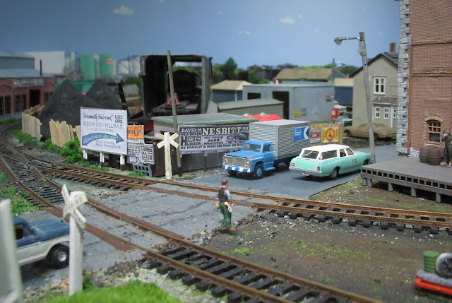 The concept of 'loose-car railroading' is just about gone. Going miles to lift of set out one car to a shipper or consignee? Can we make money doing that? Well, on my HO scale Hanley Spur layout, it's still happening, albeit in a modelled era being nominally 1970. (Don't bother telling me it's a '73 Ford or a '76 Trans Am. It's nominally 1970, though I include industries and operations just before and just after that date.) This post covers 10 feet, took about 20 minutes, and resulted in 150 digital images. (Are you ready to see all 150? Don't worry, you won't have to. A good photographer doesn't show his bad pictures, and there were...many.). At Wellington Street crossing (top photo), the freight shed lead leaves the Hanley Spur and heads downtown and to Canadian Locomotive Co. We're waiting for our train. The conductor is ready to flag the crossing.
