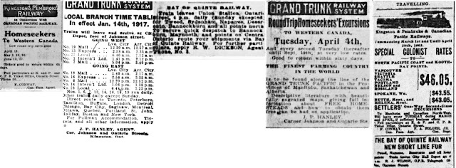 Above - Various Kingston British Daily Whig newspaper advertisements for BofQ (1912 small), K&P (1911) and GTR (1911 and 1917) and all three (1911). Click for a larger version.